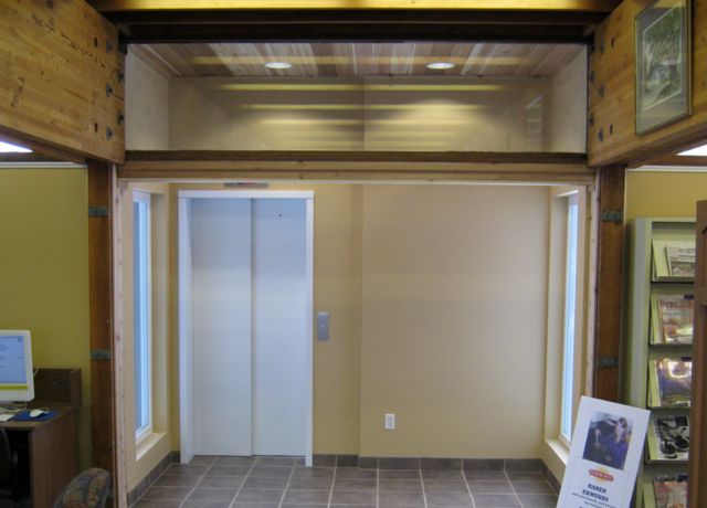 King City Library accessibility upgrades, including washroom modifications, a new LULA elevator and supporting structure, and new front entrance ramp and sliding doors.